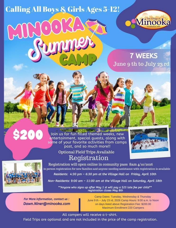 The Village of Minooka hosts a seven-week Summer Camp each year in June and July for children ages 5 to 12 years. Join us for fun filled themed weeks, new entertainment, special guests, along with some of your favorite activities from camps past and so much more! For more information, please email SummerCamp@Minooka.com