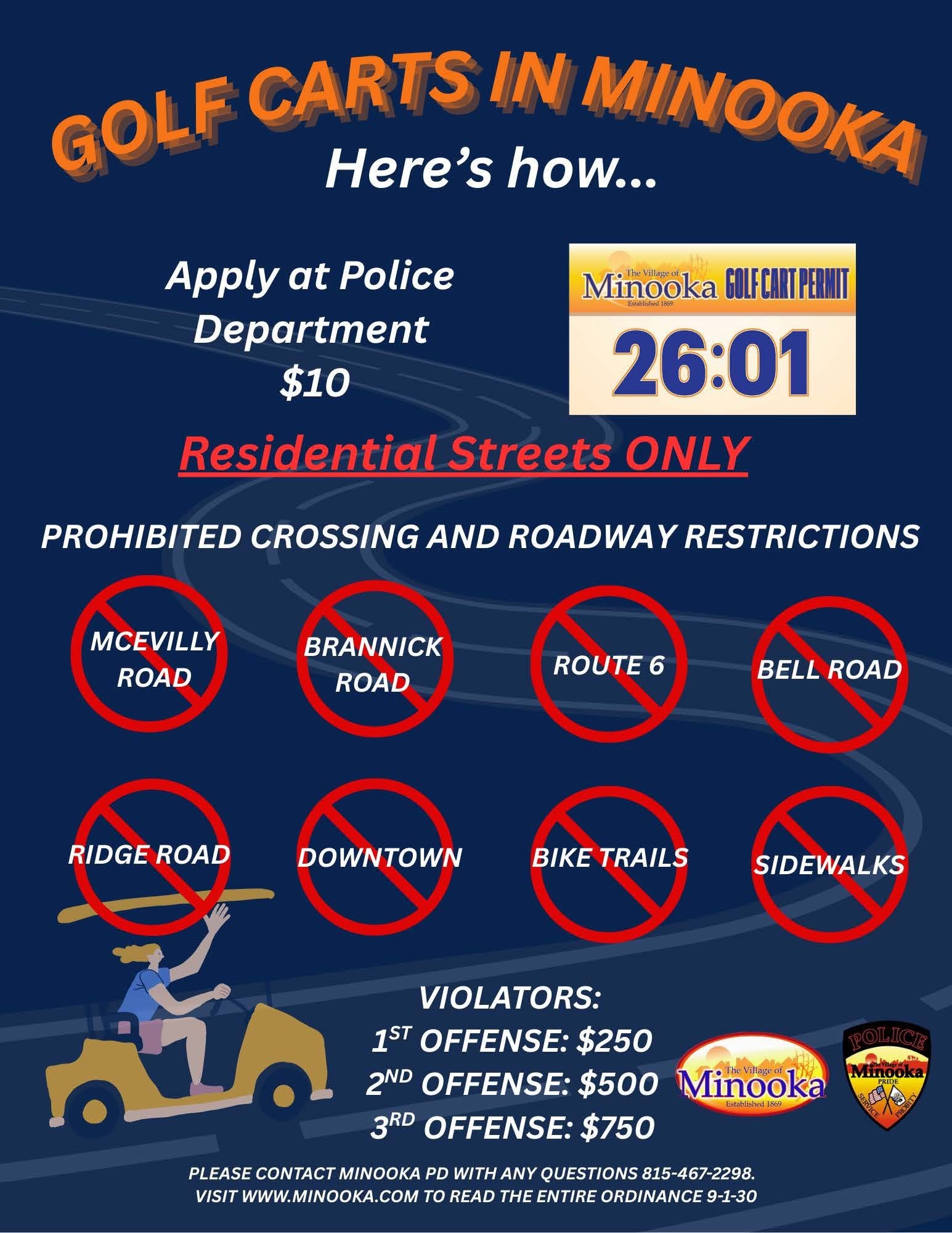 An ordinance allowing permitted and inspected golf carts on Village streets was passed at the September 2025 Village Board meeting. To apply please visit the Minooka Police Department during their regular office hours of 8:00am - 4:30pm for an application.