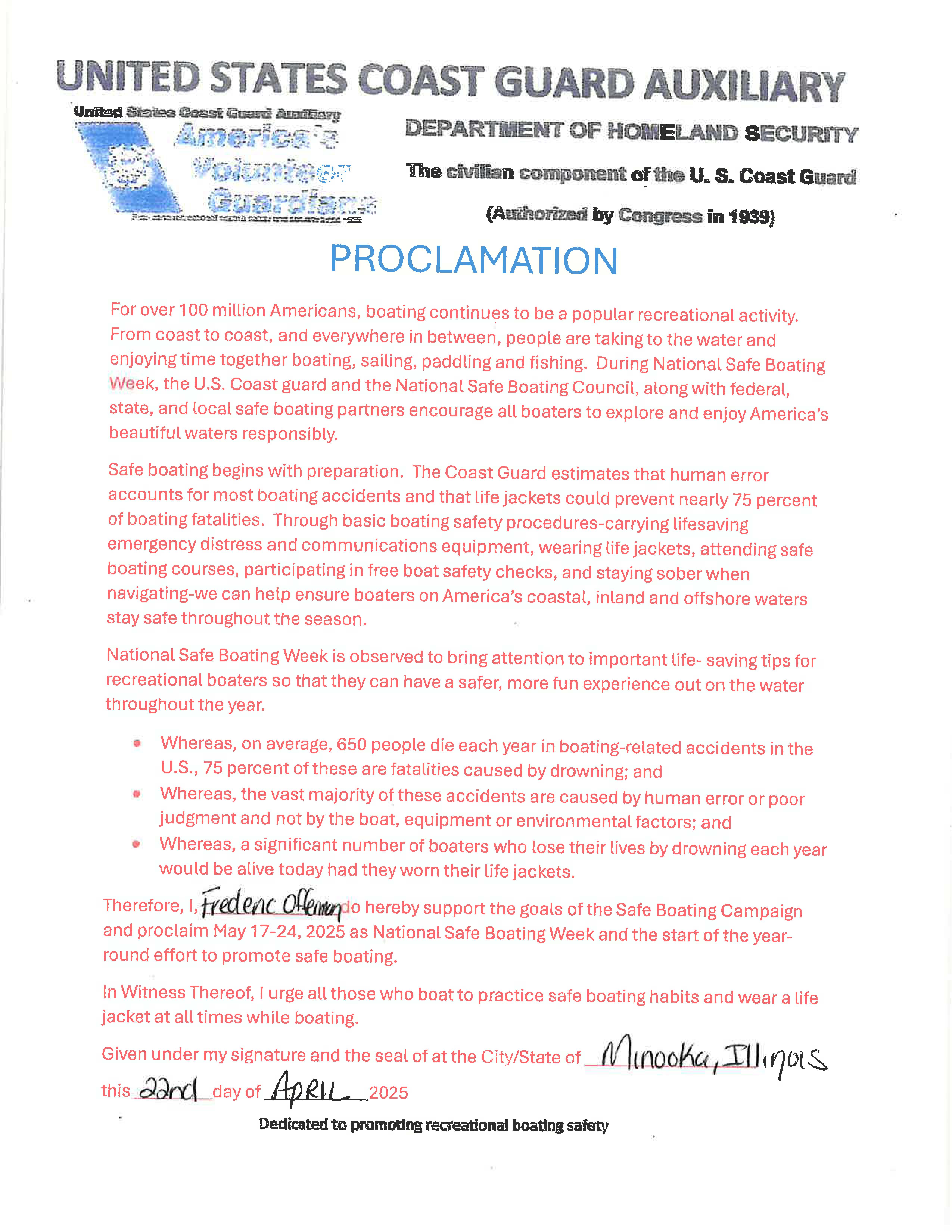 Village President Frederic Offerman, has signed a proclamation supporting the Safe Boating Campaign and National Safe Boating Week. Most boating related fatalities are a result of human error and almost 75% of boating related fatalities could be prevented by life jackets. This proclamation, supported by the United States Coast Guard, is an important reminder to have fun and be safe as we head into summer.